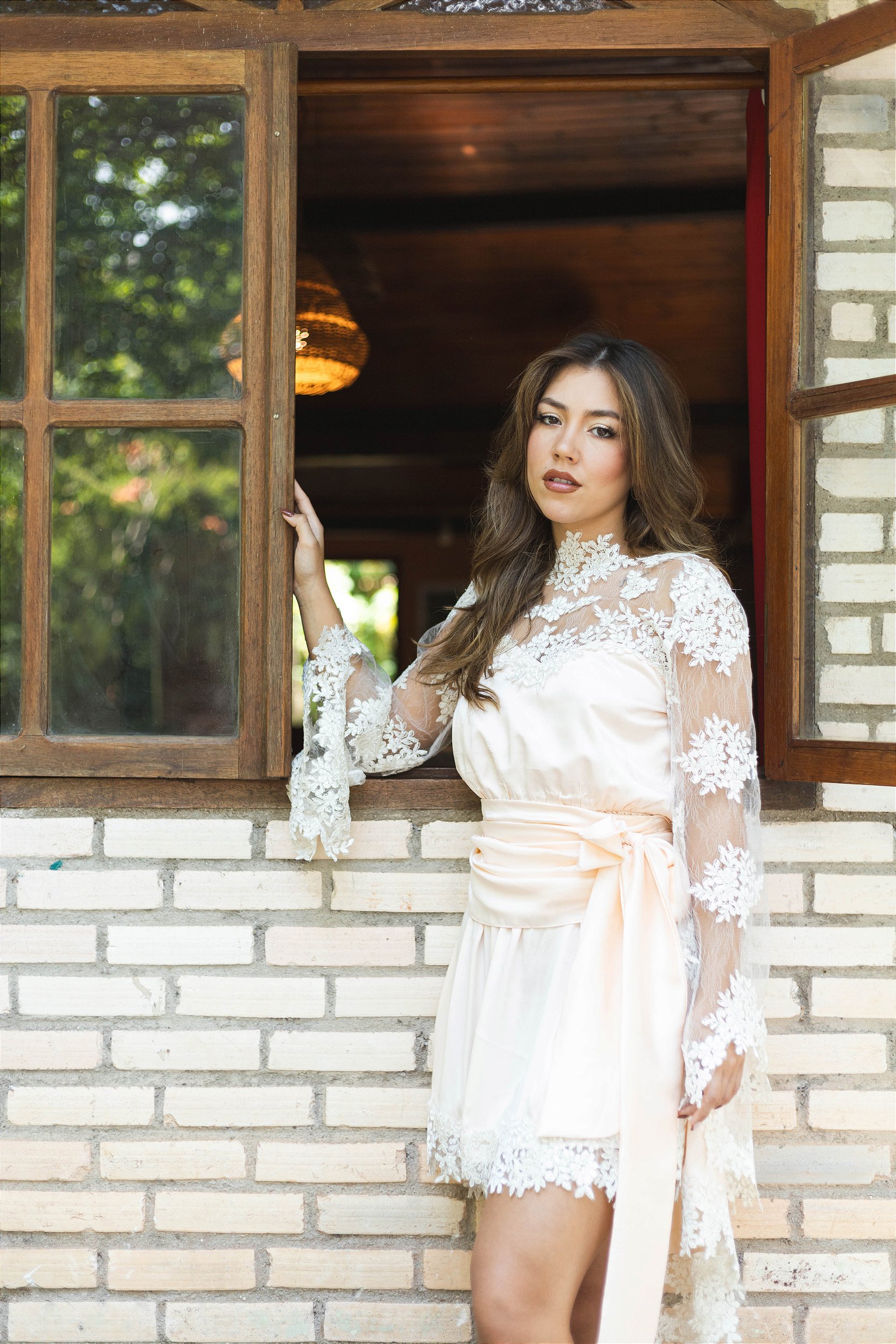 Descubra a sofisticação da nossa coleção Laços e Rendas com este vestido exclusivo em tom salmão. Uma peça que une a fluidez incomparável do cetim de 100% seda com a delicadeza romântica da renda.